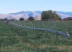 A series of pipes, each with a wheel of about 1.5 m diameter permanently affixed to its midpoint and sprinklers along its length, are coupled together at one edge of a field. Water is supplied at one end using a large hose. After sufficient water has been applied, the hose is removed and the remaining assembly rotated either by hand or with a purpose-built mechanism, so that the sprinklers move 10 m across the field. The hose is reconnected. The process is repeated until the opposite edge of the field is reached. This system is less expensive to install than a center pivot, but much more labor intensive to operate, and it is limited in the amount of water it can carry. Most systems utilize 4 or 5-inch (130 mm) diameter aluminium pipe. One feature of a lateral move system is that it consists of sections that can be easily disconnected. They are most often used for small or oddly-shaped fields, such as those found in hilly or mountainous regions, or in regions where labor is inexpensive.