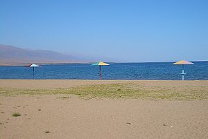 The lake's southern shore is dominated by the ruggedly beautiful Tian Shan mountain range. The lake water has salinity of approx. 0.6% (less than 20% that of seawater) and its level drops by approximately 5 cm per year.