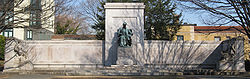 A bronze and granite memorial residing near the Southeast corner of Washington, D.C.'s Meridian Hill Park was designed by architect William Gorden Beecher and sculpted by Maryland artist Hans Schuler. Commissioned in 1916 but not approved by the U.S. Congress until 1918, and not completed and unveiled until June 26, 1930, the memorial features a statue of Buchanan bookended by male and female classical figures representing law and diplomacy, with the engraved text reading: "The incorruptible statesman whose walk was upon the mountain ranges of the law", a quote from a member of Buchanan's cabinet, Jeremiah S. Black.