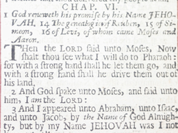 • William Tyndale, in his 1530 translation of the first five books of the English Bible, at Exodus 6:3 renders the divine name as Iehovah. In his foreword to this edition he wrote: "Iehovah is God's name... Moreover, as oft as thou seeist LORD in great letters (except there be any error in the printing) it is in Hebrew Iehovah."