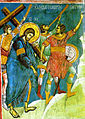 The New Testament accounts of the resurrection and ascension of Jesus, state that the first day of the week after the crucifixion (typically interpreted as a Sunday), his followers encounter him risen from the dead, after his tomb is discovered to be empty. The resurrected Jesus appears to them that day and a number of times thereafter, delivers sermons and commissions them, before ascending to Heaven. When the tomb is discovered empty ( Matthew 28:5, Mark 16:5, Luke 24:4 and John 20:12) his followers arrive there early in the morning meet either one or two beings (either men or angels) dressed in bright robes who appear in or near the tomb. Mark 16:9 and John 20:15 indicate that Jesus appeared to the Magdalene first, and Luke 16:9 states that she was among the Myrrhbearers.