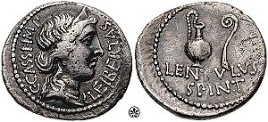 Denarius (42 BC) issued by Cassius Longinus and Lentulus Spinther, depicting the crowned head of Liberty and on the reverse a sacrificial jug and lituus, from the military mint in Smyrna.