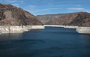 Lake Mead is the largest man-made lake and reservoir in the United States. It is located on the Colorado River about 30 miles (48 km) southeast of Las Vegas, Nevada, in the states of Nevada and Arizona. Formed by water impounded by Hoover Dam, it extends 110 mi (180 km) behind the dam, holding approximately 28.5 million acre feet (35 km³) of water. The water held in Lake Mead is released to communities in southern California, via aqueducts, and Nevada.