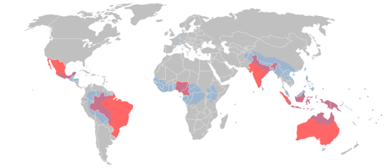 Together, the eight countries in red contain more than 50% of the world's languages. The areas in blue are the most linguistically diverse in the world, and the locations of most of the world's endangered languages.