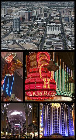 | A montage of the City of Las Vegas; From top to bottom: Las Vegas, Vegas Vic, Binion's Horseshoe, Fremont Street Experience, and Plaza Hotel & Casino | |||
