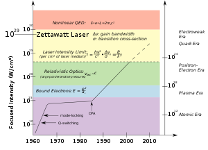 Graph showing the history of maximum laser pulse intensity throughout the past 40 years.