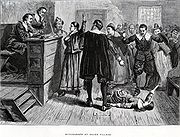 A depiction of a 1600s criminal trial, for witchcraft in Salem