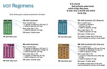 MDT for multibacillary leprosy consists of rifampicin, dapsone, and clofazimine taken over 12 months. Dosages adjusted appropriately for children and adults are available in all primary health centres in the form of blister packages. Single dose MDT for single lesion leprosy consists of rifampicin, ofloxacin, and minocycline. The move toward single-dose treatment strategies has reduced the prevalence of disease in some regions, since prevalence is dependent on duration of treatment. World Leprosy Day was created to draw awareness to leprosy and its sufferers.