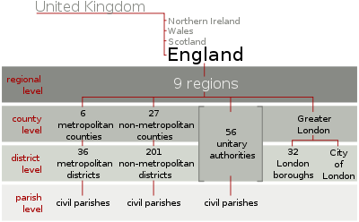 | Unitary authority | Bath and North East Somerset · Bedford · Blackburn with Darwen · Blackpool · Bournemouth · Bracknell Forest · Brighton and Hove · Bristol · Central Bedfordshire · Cheshire East · Cheshire West and Chester · Cornwall · County Durham ·Derby · Darlington · East Riding of Yorkshire · Halton · Hartlepool · Herefordshire · Isle of Wight · Kingston upon Hull · Leicester · Luton · Medway · Middlesbrough · Milton Keynes · North East Lincolnshire · North Lincolnshire · North Somerset · Northumberland ·Nottingham · Peterborough · Plymouth · Poole · Portsmouth · Reading · Redcar and Cleveland · Rutland · Slough · Southampton · Southend-on-Sea · South Gloucestershire · Stockton-on-Tees · Stoke-on-Trent · Shropshire · Swindon · Telford and Wrekin · Thurrock · Torbay · Warrington · West Berkshire · Wiltshire · Windsor and Maidenhead · Wokingham · York | 55 |