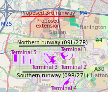 - On 25 February 2008, Greenpeace activists protesting against the planned third runway managed to cross the tarmac and climb atop a British Airways Airbus A320, which had just arrived from Manchester Airport. At about 09:45 GMT the protesters unveiled a banner, saying "Climate Emergency – No Third Runway", over the aircraft's tailfin. By 11:00 GMT four arrests had been made.