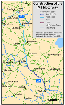 The first section of the motorway opened between Junction 5 ( Watford) and Junction 18 ( Crick/ Rugby) on 2 November 1959 together with the motorway's two spurs, the M10 (from Junction 7 to south of St Albans originally connecting to the A1) and the M45 (from Junction 17 to the A45 and Coventry). Parts of the Hertfordshire section were built using steam rollers.