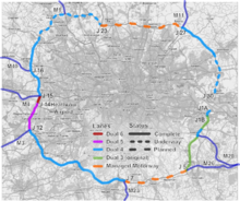 J12 → M3 motorway Junction 2 J15 → M4 motorway Junction 4b J16 → M40 motorway Junction 1a J21 → M1 motorway Junction 6a J23 → A1(M) motorway Junction 1 J27 → M11 motorway Junction 6 |