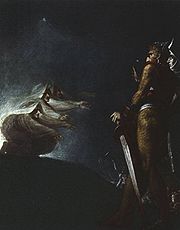 At least since the days of Alexander Pope and Samuel Johnson, analysis of the play has centred on the question of Macbeth's ambition, commonly seen as so dominant a trait that it defines the character. Johnson asserted that Macbeth, though esteemed for his military bravery, is wholly reviled. This opinion recurs in critical literature, and, according to Caroline Spurgeon, is supported by Shakespeare himself, who apparently intended to degrade his hero by vesting him with clothes unsuited to him and to make Macbeth look ridiculous by several nimisms he applies: His garments seem either too big or too small for him – as his ambition is too big and his character too small for his new and unrightful role as king. When he feels as if "dressed in borrowed clothes", after his new title as Thane of Cawdor, prophesied by the witches, has been confirmed by Rosse (I, 3, ll. 108–109), Banquo comments: "New honours come upon him, /Like our strange garments, cleave not to their mould, / But with the aid of use" (I, 3, ll. 145–146). And, at the end, when the tyrant is at bay at Dunsinane, Caithness sees him as a man trying in vain to fasten a large garment on him with too small a belt: "He cannot buckle his distemper'd cause / Within the belt of rule" (V, 2, ll. 14–15), while Angus, in a similar nimism, sums up what everybody thinks ever since Macbeth`s accession to power: "now does he feel his title / Hang loose about him, like a giant's robe / upon a dwarfish thief" (V, 2, ll. 18–20).