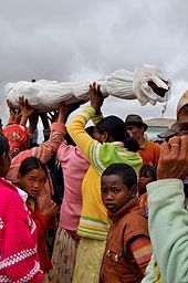 Approximately half of the country's population practice traditional religion, which tends to emphasize links between the living and the razana (ancestors). The veneration of ancestors has led to the widespread tradition of tomb building, as well as the highlands practice of the famadihana, whereby a deceased family member's remains may be exhumed to be periodically re-wrapped in fresh silk shrouds before being replaced in the tomb. The famadihana is an occasion to celebrate the beloved ancestor's memory, reunite with family and community, and enjoy a festive atmosphere. Residents of surrounding villages are often invited to attend the party, where food and rum are typically served and a hiragasy troupe or other musical entertainment is commonly present. Consideration for ancestors is also demonstrated through adherence to fady, taboos that are respected during and after the lifetime of the person who establishes them. It is widely believed that by showing respect for ancestors in these ways, they may intervene on behalf of the living. Conversely, misfortunes are often attributed to ancestors whose memory or wishes have been neglected. The sacrifice of zebu is a traditional method used to appease or honour the ancestors. In addition, the Malagasy traditionally believe in a creator god, called Zanahary or Andriamanitra.