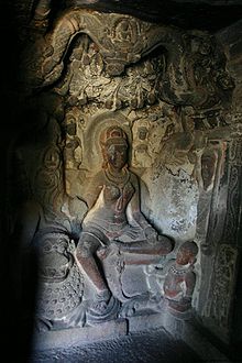 An image of Ambika under a mango tree in Cave 34 of the Ellora Caves