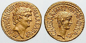Marcus Antonius (in latin: M·ANTONIVS·M·F·M·N) (c. January 14, 83 BC– August 1, 30 BC), known in English as Mark Antony, was a Roman politician and General. He was an important supporter of Gaius Julius Caesar as a military commander and administrator, being the son of one of Caesar's paternal cousins. After Caesar's assassination, Antony formed an official political alliance with Octavian (Augustus) and Marcus Aemilius Lepidus, known to historians today as the Second Triumvirate.