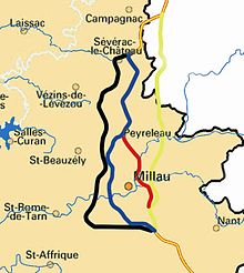 - Great Western (grand Ouest) ( black route ), longer than the eastern option by 12 km (7.5 mi), following the Cernon valley. Technically easier (requiring four viaducts), this solution was judged to have negative impacts on the environment, in particular on the picturesque villages of Peyre and Saint-Georges-de-Luzençon. More expensive than the preceding option, and serving the region badly, this option was also abandoned.