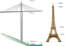 - The highest pylons in the world: pylons P2 and P3, 244.96 metres (803 ft 8 in) and 221.05 metres (725 ft 3 in) in height respectively, broke the French record previously held by the Tulle and Verrières viaducts (141 m/463 ft), and the world record previously held by the Kochertal Viaduct (Germany), which is 181 metres (594 ft) at its highest;