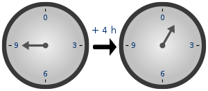 A familiar use of modular arithmetic is its use in the 24-hour clock: the arithmetic of time-keeping in which the day runs from midnight to midnight and is divided into 24 hours, numbered from 0 to 23. If the time is 19:00 now — 7 o'clock in the evening — then 8 hours later it will be 3:00. Usual addition would suggest that the later time should be 19 + 8 = 27, but this is not the answer because clock time "wraps around" at the end of the day. Likewise, if the clock starts at 12:00 (noon) and 21 hours elapse, then the time will be 09:00 the next day, rather than 33:00. Since the hour number starts over when it reaches 24, this is arithmetic modulo 24. It should be noted that in this system 24:00 is not a valid time because this is equal to the 0:00 of the next day, in much the same way 2:60 is not a valid time because it is equal to 3:00.