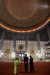 In modern Turkey non-Muslim tourists are allowed to enter any mosque, but there are some strict rules. Visiting a mosque is allowed only between prayers; visitors are required to wear long trousers and not to wear shoes, women must cover their heads; visitors are not allowed to interrupt praying Muslims, especially by taking photos of them; no loud talk is allowed; and no references to other religions are allowed (no crosses on necklaces, no cross gestures etc.) Similar rules apply to mosques in Malaysia, where larger mosques that are also tourist attractions (such as the Masjid Negara) provide robes and headscarves for visitors who are deemed inappropriately attired.