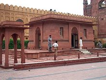 The tomb of Muhammad Iqbal at the entrance of the Badshahi Mosque in Lahore.