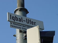 Name plate of a street Iqbal-Ufer, Heidelberg, Germany, honoured in the name of Iqbal.