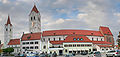 St Michael in Berg am Laim might be the most remarkable church out of the inner city. Most of the boroughs have parish churches which originate from the Middle Ages like the most famous church of pilgrimage in Munich St Mary in Ramersdorf. The oldest church within the city borders is Heilig Kreuz in Fröttmaning next to the Allianz-Arena, known for its Romanesque fresco. Especially in its suburbs, Munich features a wide and diverse array of modern architecture, although strict culturally sensitive height limitations for buildings have limited the construction of skyscrapers to avoid a loss of views to the distant Bavarian Alps. Most high-rise buildings are clustered at the northern edge of Munich in the skyline, like the Hypo-Haus, the Arabella High-Rise Building, the Highlight Towers, Uptown Munich, Münchner Tor and the BMW Headquarters next to the Olympic Park. Several other high-rise buildings are located near the city centre and on the Siemens campus in southern Munich. A landmark of modern Munich is also the architecture of the sport stadiums (as described below).
