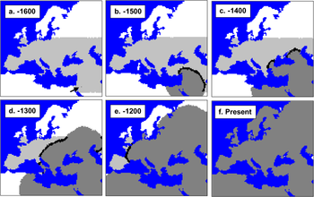 mtDNA-based simulation of modern human expansion in Europe starting 1600 generations ago. Neanderthal range in light grey.