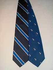 The two variants of the school tie for Phillips Academy. The striped version uses American-style stripes (high side of stripe on wearer's right).