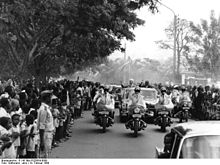 President Hamani Diori and visiting German President Dr. Heinrich Lübke greet crowds on a state visit to Niamey, 1969. Diori's single party rule was characterized by good relations with the west and a preoccupation with foreign affairs.