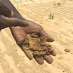 Drought has turned farmland into useless soil. A farmer examines the soil in drought stricken Niger during the 2005 famine.