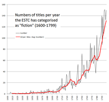 Back in the early 18th century some 20–60 titles per year, that is between one and three percent of the total annual English production of about 2,000 titles, could be reckoned as fiction – a total of 20,000–60,000 copies on the assumption of standard print runs of about 1,000 copies. In 2001 fiction made about 11% of the 119,001 titles published in the UK consumer book market. The percentage has remained relatively stable over the past 20 years, though the total numbers doubled from 5,992 in 1986 to 13,076 in 2001. The press output and the money made with fiction have risen disproportionately since the 18th century: According to Nielsen BookScan statistics published in 2009 UK publishers sold an estimated 236.8 million books in 2008. Adult fiction (an estimated 75.3 million copies) made 32% of this market. Children's, young adult and educational books, a section comprising best-sellers such as the Harry Potter volumes, made another 63.4 million copies, 27%. The total UK consumer market is supposed to have had a value £1,773m in 2008. Adult fiction made roughly a quarter of that value: £454m.