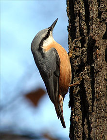 | A Eurasian Nuthatch climbing a tree trunk in search of food | |