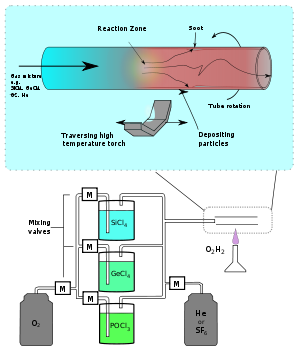 With inside vapor deposition, the preform starts as a hollow glass tube approximately 40 centimeters (16 in) long, which is placed horizontally and rotated slowly on a lathe. Gases such as silicon tetrachloride (SiCl4) or germanium tetrachloride (GeCl4) are injected with oxygen in the end of the tube. The gases are then heated by means of an external hydrogen burner, bringing the temperature of the gas up to 1900 K (1600 °C, 3000 °F), where the tetrachlorides react with oxygen to produce silica or germania (germanium dioxide) particles. When the reaction conditions are chosen to allow this reaction to occur in the gas phase throughout the tube volume, in contrast to earlier techniques where the reaction occurred only on the glass surface, this technique is called modified chemical vapor deposition (MCVD).