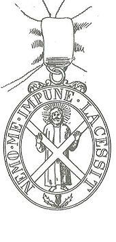 - At the right hip of the Riband, the badge of the Order is attached. The badge depicts St Andrew in the same form as the badge-appendant surrounded by the Order's motto.