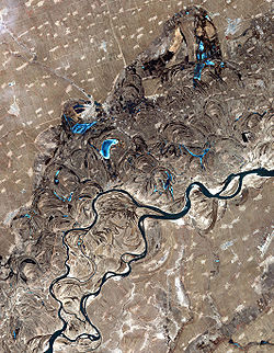 Songhua River, northeast China. Swirls and curves, showing paths the river once took, as well as oxbow lakes, are easily seen in this satellite photo.