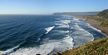 The andesite line is the most significant regional distinction in the Pacific. It separates the deeper, mafic igneous rock of the Central Pacific Basin from the partially submerged continental areas of felsic igneous rock on its margins. The andesite line follows the western edge of the islands off California and passes south of the Aleutian arc, along the eastern edge of the Kamchatka Peninsula, the Kuril Islands, Japan, the Mariana Islands, the Solomon Islands, and New Zealand's North Island.