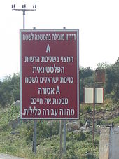- Area A (full civil and security control by the Palestinian Authority): circa 3% of the West Bank, exclusive East-Jerusalem (first phase, 1995). In 2011: 18%. This area includes all Palestinian cities and their surrounding areas, with no Israeli settlements. Entry into this area is forbidden to all Israeli citizens. The Israel Defense Forces maintain no presence, but sometimes conducts raids to arrest suspected militants.