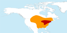 | Distribution map, with breeding zone in red and wintering zone in orange | |