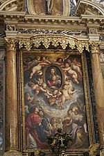 The subject was to be St. Gregory the Great and important local saints adoring an icon of the Virgin and Child. The first version, a single canvas (now at the Musée des Beaux-Arts, Grenoble), was immediately replaced by a second version on three slate panels that permits the actual miraculous holy image of the "Santa Maria in Vallicella" to be revealed on important feast days by a removable copper cover, also painted by the artist.