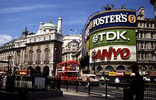 TDK added its sign in 1990, the space having been previously used by Schweppes (1920–61), BP (1961–7), Cinzano (1967–78), Fujifilm (1978–86) and Kodak (1986–90). The original neon sign remained almost unchanged for twenty years, although in 2001, the colour of the background lamps was changed from green to blue, and the words "Audio & Video Tape" and "Floppy Disks" under the TDK logo were removed. In 2010, the sign was replaced by an LED screen.