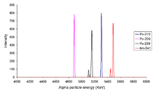 From left to right the peaks are due to 209Po, 210Po, 239Pu and 241Am. The fact that isotopes such as 239Pu and 241Am have more than one alpha line indicates that the nucleus has the ability to be in different discrete energy levels (like a molecule can).