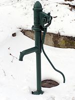 One sort of pump once common worldwide was a hand-powered water pump over a water well where people could work it to extract water, before most houses had individual water supplies.