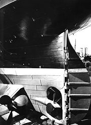 Exhaust steam leaving the reciprocating engines was fed into the turbine, which was situated aft. From there it passed into a condenser, to increase the efficiency of the turbine and so that the steam could be condensed back into water and reused. The engines were attached directly to long shafts which drove the propellers. There were three, one for each engine; the outer (or wing) propellers were the largest, each carrying three blades of manganese-bronze alloy with a total diameter of 23.5 feet (7.2 m). The central propeller was somewhat smaller at 17 feet (5.2 m) in diameter, and could be stopped but not reversed.
