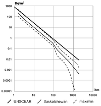 | 1,000,000 | 27000 | Concentrations reaching 1,000,000 Bq/m3 can be found in unventilated uranium mines. |