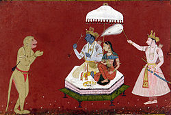 ![]() Lord Rama (centre) with wife Sita, brother Lakshmana (with fan) and devotee, Hanuman (far left).  |