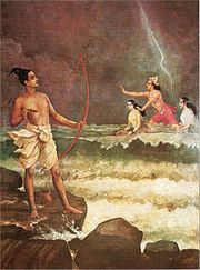 Faced with the dilemma of how to cross the ocean, Rama performs a penance tapasya, fasting and meditating in perfect dhyana for three days and three nights to sagara, the Lord of Oceans. The ocean god does not respond out of arrogance , and Rama on the fourth morning,pointed the brahmastra towards the ocean . The Vanaras are dazzled and fearful at witnessing the enraged Rama demolish the oceans, and Lakshmana prays to calm Rama's mind. Just as Rama invokes the brahmastra, considered the most powerful weapon capable of destroying all creation, Saagara arises out of the oceans. He bows to Rama, and begs for pardon. Since lord Rama had to use the weapon , he suggests Rama re-direct the weapon at a demonic race that lives in the heart of the ocean. Rama's arrows destroys the demons, and establishes a purer, liberated environment there. Saagara promises that he would keep the oceans still for all of Rama's army to pass, and Nala constructs a bridge ( Rama's Bridge) across to Lanka. Rama justifies his angry assault on the oceans as he followed the correct process of petitioning and worshipping Saagara, but obtaining the result by force for the greater good.
