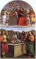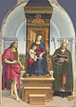 His first documented work was the Baronci altarpiece for the church of Saint Nicholas of Tolentino in Città di Castello, a town halfway between Perugia and Urbino. Evangelista da Pian di Meleto, who had worked for his father, was also named in the commission. It was commissioned in 1500 and finished in 1501; now only some cut sections and a preparatory drawing remain. In the following years he painted works for other churches there, including the " Mond Crucifixion" (about 1503) and the Brera Wedding of the Virgin (1504), and for Perugia, such as the Oddi Altarpiece. He very probably also visited Florence in this period. These are large works, some in fresco, where Raphael confidently marshalls his compositions in the somewhat static style of Perugino. He also painted many small and exquisite cabinet paintings in these years, probably mostly for the connoisseurs in the Urbino court, like the Three Graces and St. Michael, and he began to paint Madonnas and portraits. In 1502 he went to Siena at the invitation of another pupil of Perugino, Pinturicchio, "being a friend of Raphael and knowing him to be a draughtsman of the highest quality" to help with the cartoons, and very likely the designs, for a fresco series in the Piccolomini Library in Siena Cathedral. He was evidently already much in demand even at this early stage in his career.