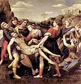 Leonardo was more than thirty years older than Raphael, but Michelangelo, who was in Rome for this period, was just eight years his senior. Michelangelo already disliked Leonardo, and in Rome came to dislike Raphael even more, attributing conspiracies against him to the younger man. Raphael would have been aware of his works in Florence, but in his most original work of these years, he strikes out in a different direction. His Deposition of Christ draws on classical sarcophagi to spread the figures across the front of the picture space in a complex and not wholly successful arrangement. Wöllflin detects the influence of the Madonna in Michelangelo's Doni Tondo in the kneeling figure on the right, but the rest of the composition is far removed from his style, or that of Leonardo. Though highly regarded at the time, and much later forcibly removed from Perugia by the Borghese, it stands rather alone in Raphael's work. His classicism would later take a less literal direction.