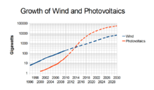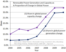 From the end of 2004, worldwide renewable energy capacity grew at rates of 10–60% annually for many technologies. For wind power and many other renewable technologies, growth accelerated in 2009 relative to the previous four years. More wind power capacity was added during 2009 than any other renewable technology. However, grid-connected PV increased the fastest of all renewables technologies, with a 60% annual average growth rate. In 2010, renewable power constituted about a third of the newly built power generation capacities. By 2014 the installed capacity of photovoltaics will likely exceed that of wind, but due to the lower capacity factor of solar, the energy generated from photovoltaics is not expected to exceed that of wind until 2015.
